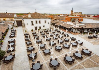 Es un amplio patio empedrado castellano, con decoración floral, porches con columnas, carros y útiles de labranza en madera, destacar en los porches una representación de una fragua y una prensa de molino.